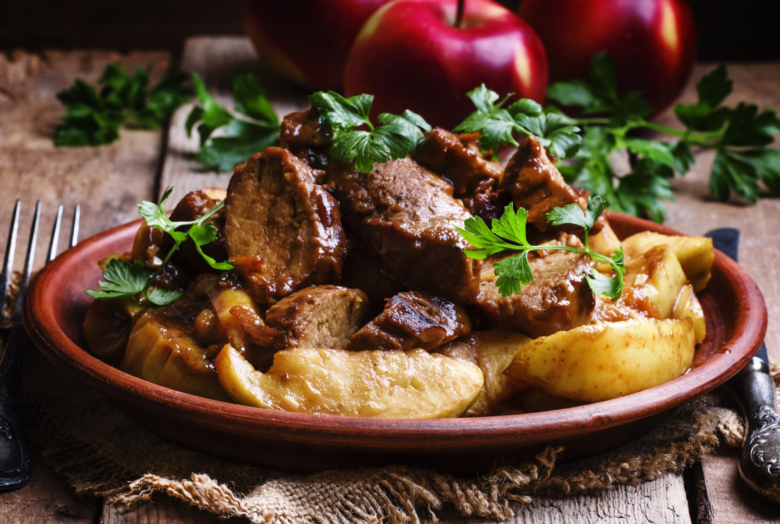 Geschmorter Hirsch-Edelgoulasch mit Apfel-Rotkraut & hausgemachten Kräuter-Servietten-Knödeln